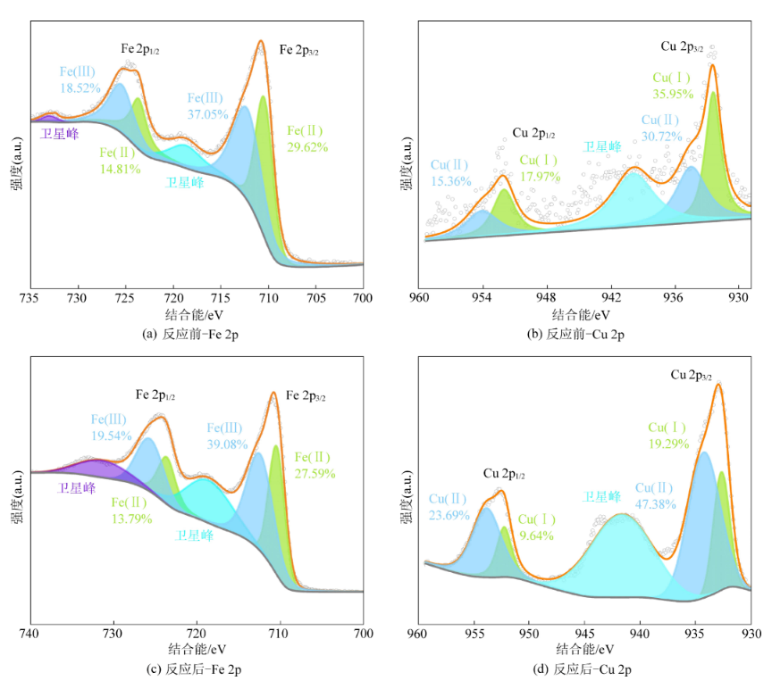 圖 FHC與O3協同去除Cu(Ⅱ)-EDTA反應前后冷凍干燥產物的Fe 2p、Cu 2p