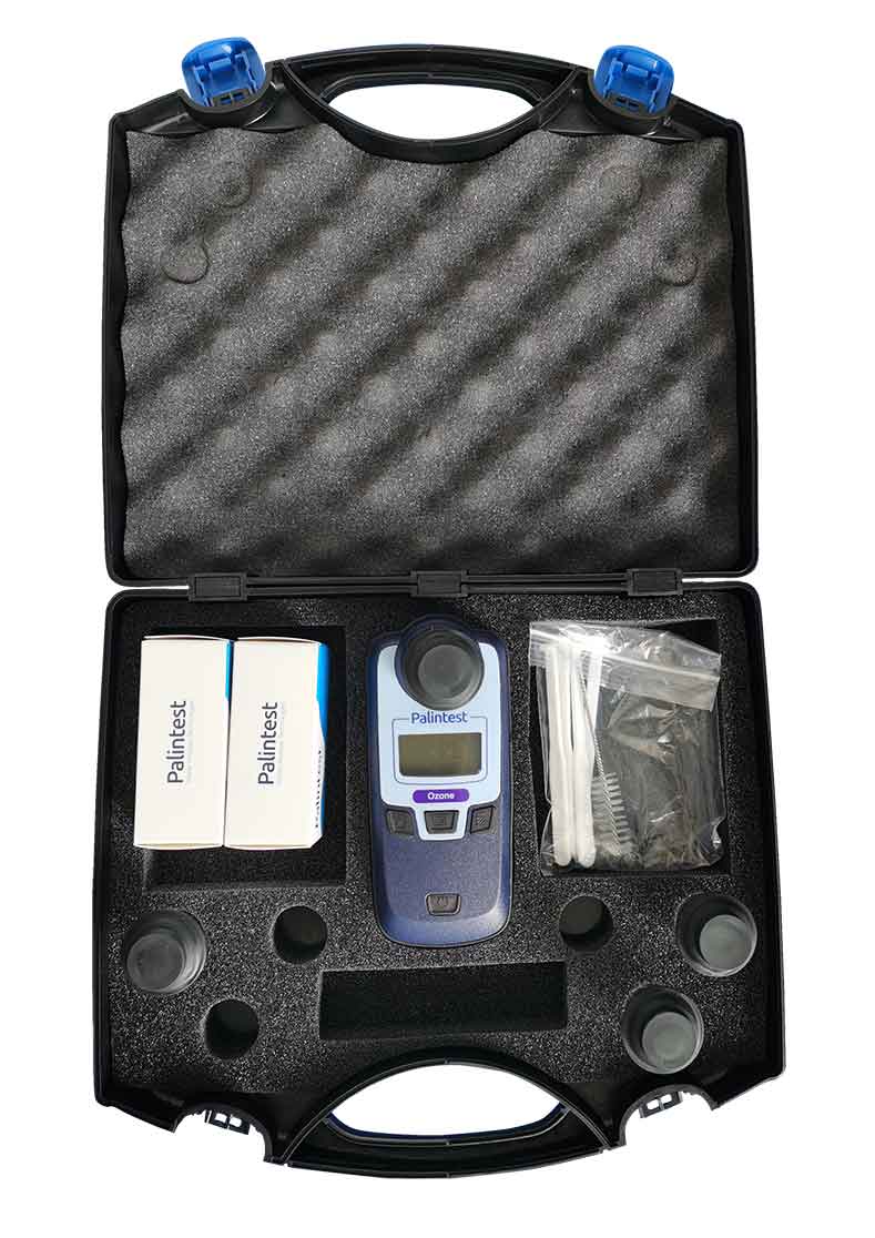 Palintest臭氧測量計隨硬質手提箱提供,套件內包含檢測所需的DPD試劑和所有配件。