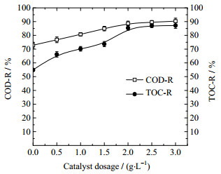 在COD為500 mg·L-1,進料pH為6.63,反應溫度20 ℃,反應時間90 min,臭氧濃度60 mg·L-1,氣體流量1 L·min-1條件下,考察多組分催化劑用量對水樣COD和TOC去除率的影響,如圖 6所示。
