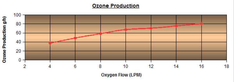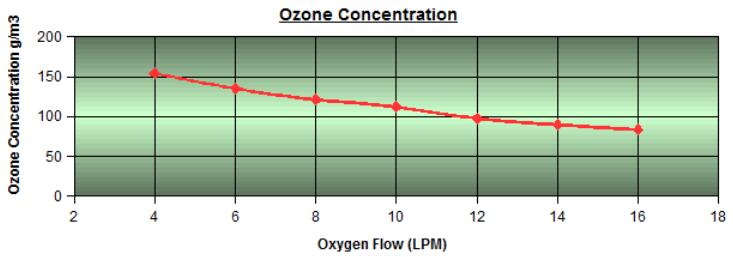 圖表顯示了臭氧發生器濃度與進料氣體流量的比較,以顯示在任何給定流量下臭氧發生器的確切濃度。通常,臭氧發生器濃度(g/m3或重量百分比)將隨著進氣流量(LPM或SCFH)的減少而增加。這將說明在任何給定的進料氣流速下可能的臭氧濃度,表明該臭氧發生器將氧氣轉化為臭氧的效率。