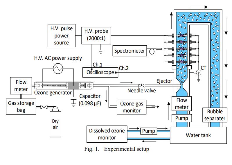 圖1顯示了一個實驗裝置。該系統包括臭氧發生器、噴射器、泵、脈沖電源和脈沖放電裝置。臭氧是用填充玻璃微珠(微珠尺寸:6 mm)的DBD裝置產生的。臭氧發生器由一個逆變電源(4210,NF公司)和一個升壓變壓器(YHT-15K-0.5K, Yamabishi Electric)施加交流高壓。使用高壓探頭(EP-50K,日新脈沖電子公司)測量臭氧發生器的施加電壓(V)。電荷(q)是通過積分電容器上的電壓降(0.098µF)來測量的。用V-q利薩若圖面積乘以工頻計算臭氧發生器的放電功率。臭氧氣體濃度采用紫外吸收型臭氧監測儀測量。干燥空氣(絕對濕度:119.3 mg m−3)作為臭氧發生器的氣源。通過針閥調節臭氧發生器的氣體流量為2.0 L min−1。