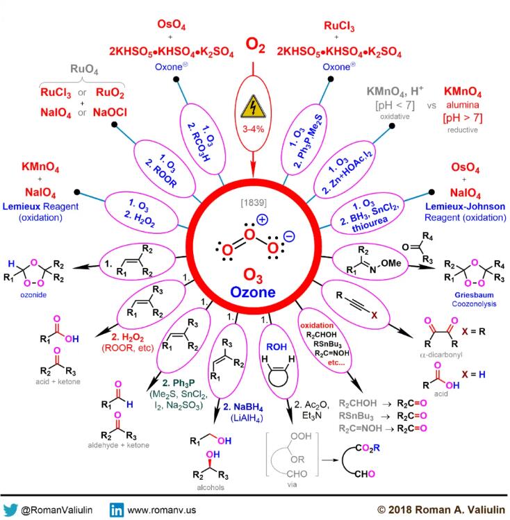 【物理性質】 無色或者淡藍色的氣體,bp–119 oC,mp –193 oC;在–80 ~ –100 oC左右,在烴類溶劑中的溶解質量分數為0.1%~0.3%。具有較強的吸收紫外線的能力,因此常在高空形成臭氧層,對地球表面的紫外線輻射起到一定的保護作用。臭氧具有刺激性的氣味,有時被描述為類似于新鮮雨后的氣味。臭氧的密度比空氣大約高一倍。