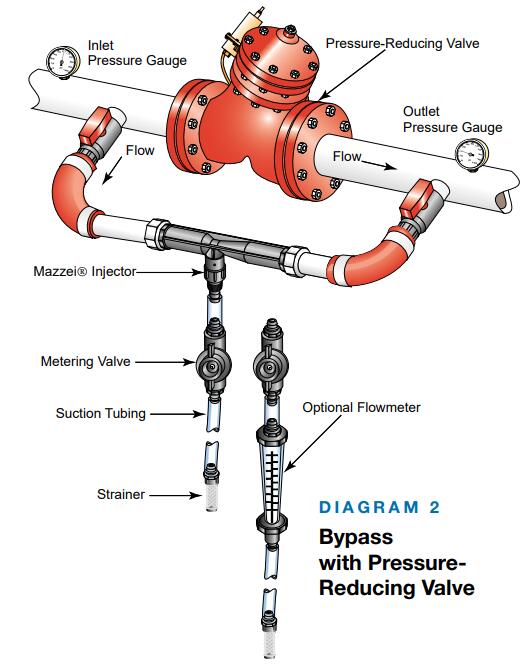 •Mazzei射流器需要壓差才能產生吸力。噴油器的出口壓力(背壓)必須充分低于進口壓力。對于大多數型號,吸力從25-30%的壓差開始。為了確保吸力一致,噴射器的出口側應充滿水或下游有一些阻力(背壓)。