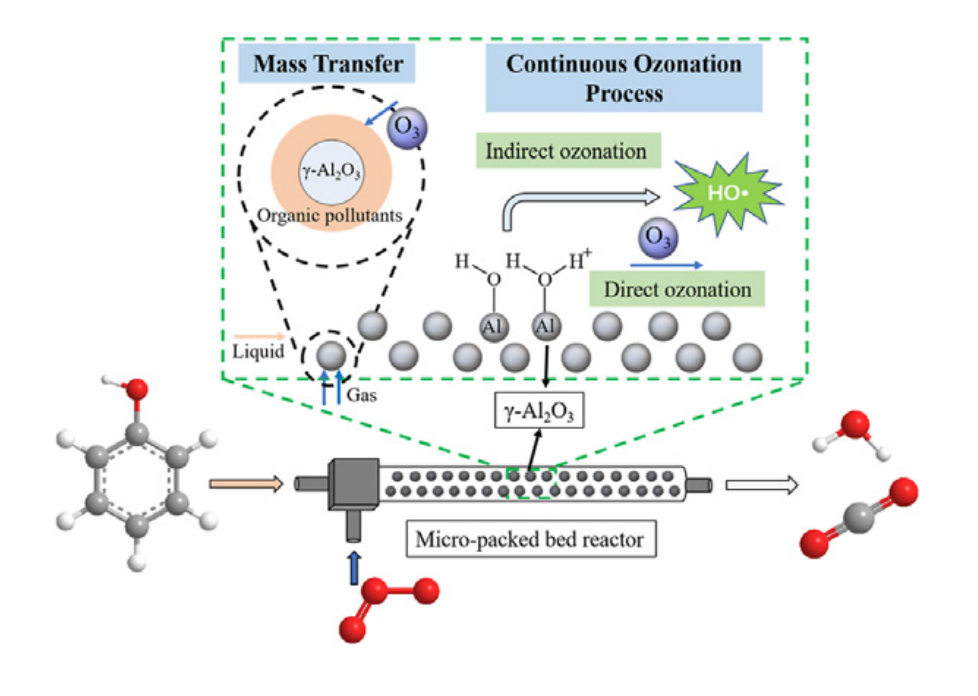 結果表明,臭氧氧化在25 s內對亞甲基藍的降解效率為74.6%,反應速率常數約為0.05 s-1 (He et al., 2016)。Nieves等人報道,在康寧先進流動反應器(AFR)中,當液體流速為5 mL/min,氣體流速為100 mL/min,傳質系數為0.80 s-1時,蘇丹紅7B染料的轉化率為66.5% (Nieves- remacha and Jensen, 2015)。微填充床反應器是在滴流床反應器小型化的基礎上提出的。由于小填充顆粒(顆粒直徑<500 mm)的傳輸尺寸小,因此它具有增強傳熱傳質和加快多相混合的優點(Zhang et al., 2018a)。mpbr由于其在氣-液-固反應(如加氫)中的優勢而受到關注(Losey et al., 2000;Yang et al., 2018;Tu等人,2020)和氧化(Yoswathananont等人,2008;al - rifai et al., 2014,2016)。al - rifai et al.(2016)報道mPBR氣液比的增加提高了苯甲醇的轉化率和苯甲醛的選擇性。Tu等(2020)報道mPBR中連續加氫反應速率提高了100倍。我們之前的研究表明,mpbr中的氣液傳質系數可高達0.12e0.39 s-1,比大型反應器的傳質系數大1-2個數量級(注:反應器參數與本工作一致)(Zhang et al., 2018a;Sang等人,2020)。迄今為止,mpbr與臭氧氧化相結合處理有機污染物的研究尚未見報道。因此,優異的氣液傳質速率表明mPBR具有實現臭氧化高效降解難降解有機污染物的潛力。本文研究了一種基于mpbr的連續臭氧化系統,用于降解難降解有機污染物??疾炝艘毫髁?、氣流量、初始pH、初始O3濃度和初始苯酚濃度對苯酚和COD去除率的影響。比較了氧化鋯陶瓷球團和g Al2O3球團填料在mPBR中的去除率。此外,在很佳操作條件下對幾種典型的有機污染物(包括酚類、抗生素和染料)進行了處理。