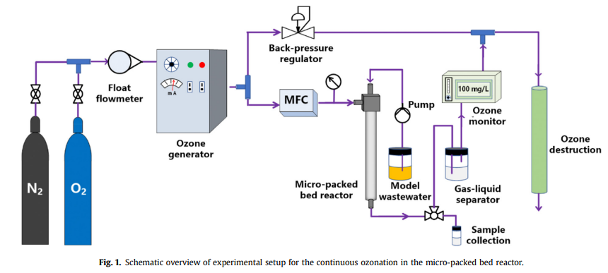微填充床反應器連續臭氧化實驗裝置示意圖如圖1所示。所有實驗均在室溫(20℃)下進行。臭氧由臭氧發生器(同林科技3S-T3)產生,供氧為純氧,氧流量在100e200ml /min范圍內,由浮子流量計(思連701HB-5)控制。在實驗之前和之后,氮氣也被添加以凈化整個流動系統。與反應器平行的背壓調節器將壓力控制在0.2 ~ 1.0 bar之間,這是臭氧發生器的正常工作壓力。這個背壓調節器也在臭氧發生器的臭氧分布中起作用。經過臭氧發生器后,臭氧-氧氣混合物被分成兩部分。一部分通過臭氧質量流量控制器(Sevenstar DO7-19B)以20e100 sccm的流量流入mPBR。另一種通過背壓調節器流出系統,并通過臭氧破壞而被破壞。臭氧監測儀(同林科技3S-J5000)監測氣相臭氧濃度。實驗過程中臭氧濃度變化范圍為30 ~ 130 mg/L,這取決于入口壓力、溫度和流量。在臭氧化反應前,首先通過關閉反應器入口來測量初始臭氧濃度(氣相)。模型有機污染物通過柱塞泵(Peek 6000LDI-P)以0.4 ~ 2.0 mL/min的流速輸送。