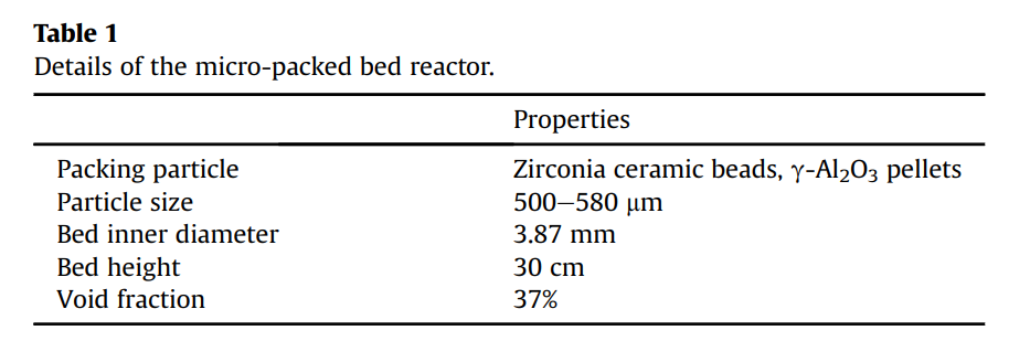 mPBR出口的氣液混合物被收集在一個帶塞的瓶子里,在這個瓶子里進行氣相和液相的分離。未反應臭氧由臭氧監測儀測量,很終通過臭氧破壞部分破壞。當臭氧被破壞時,99.9%的臭氧轉化為氧氣(表S1)。采樣時,切換三通球閥采集液體樣品。樣品采集后立即測量污染物和COD的去除率,與24 h后測量的去除率變化不大,在11.2%的范圍內。因此,未反應臭氧對污染物和COD的去除沒有影響。微填料床反應器的詳細情況如表1所示。反應器管由不銹鋼制成,長30厘米,內徑3.87毫米。將尺寸為500e580 mm的球形氧化鋯陶瓷珠或g-Al2O3球團裝入管中,孔隙率為0.37。